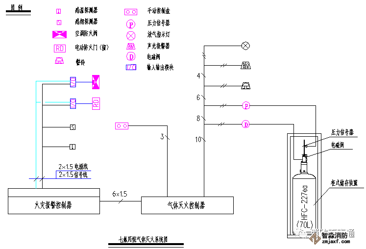 首先觸發(fā)信號(hào)防護(hù)區(qū)域內(nèi)任一設(shè)置的感煙火災(zāi)探測(cè)器作為首個(gè)聯(lián)動(dòng)觸發(fā)信號(hào)后,火災(zāi)報(bào)警控制器接收到第一報(bào)警信號(hào),同時(shí)氣體滅火控制盤(pán)接到火災(zāi)報(bào)警控制器的聯(lián)動(dòng)請(qǐng)求,啟動(dòng)設(shè)置在該防護(hù)區(qū)內(nèi)的火災(zāi)聲光警報(bào)器;再觸發(fā)感溫探測(cè)器或手動(dòng)火災(zāi)報(bào)警按鈕的報(bào)警信號(hào),火災(zāi)報(bào)警控制器接收到第二個(gè)報(bào)警信號(hào),聯(lián)動(dòng)該防護(hù)區(qū)內(nèi)的相關(guān)設(shè)備如:停止排風(fēng)機(jī)、關(guān)閉排風(fēng)閥、關(guān)閉空調(diào)電源和送風(fēng)管道上的防火閥,關(guān)閉防火門(mén)窗和降下防火卷簾門(mén);同時(shí)氣體滅火控制盤(pán)接到火災(zāi)報(bào)警控制器的第二次聯(lián)動(dòng)請(qǐng)求,啟動(dòng)設(shè)置在該防護(hù)區(qū)外的火災(zāi)聲光警報(bào)器;延時(shí)30秒后,開(kāi)啟氣體啟動(dòng)鋼瓶上的電磁閥,啟動(dòng)氣體通過(guò)傳動(dòng)管開(kāi)啟相關(guān)區(qū)域的選擇閥和打開(kāi)對(duì)應(yīng)的FM200鋼瓶組,氣體噴灑到該保護(hù)區(qū)域,氣體傳送管道上的壓力開(kāi)關(guān)有回答信號(hào),同樣保護(hù)區(qū)外的“放氣勿入”指示燈點(diǎn)亮;氣體釋放的信息反饋到火災(zāi)報(bào)警控制器上。